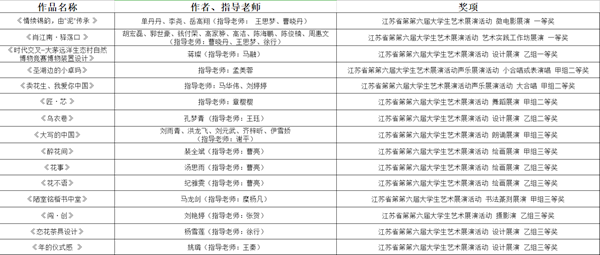 近日,江苏省教育厅公布了第六届大学生艺术展演活动各赛项获奖名单。在学校大学生艺术展演活动工作领导小组的统筹安排下,团委、艺术学院、基础部等多部门密切配合,精心备赛,共计参加舞蹈、大合唱、小合唱及表演唱、绘画、书法及篆刻、朗诵、艺术设计、艺术工坊、微电影展评9个赛项,总计获奖16项,其中一等奖3项。