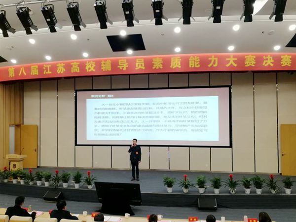 江苏高校辅导员素质能力大赛每两年举办一次,分为校内初赛、片区复赛和决赛,综合考察辅导员的理论素养、语言表达、案例处理等综合能力。决赛现场,经过基础知识测试、案例分析和谈心谈话三个环节激烈比拼,评选出一等奖8名、二等奖12名、三等奖20名。庞军老师在三环节均发挥稳定,展现了深厚的知识储备和过硬的专业能力,稳居前8名,勇夺一等奖。
