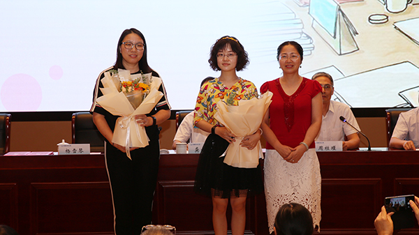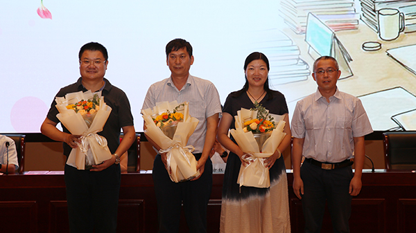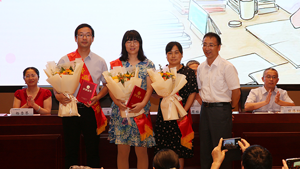 校领导分别为获表彰的人员颁发荣誉证书、为受奖单位授牌,学生代表为获奖、入选青蓝工程的老师献上鲜花。