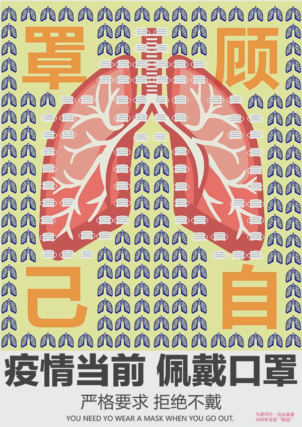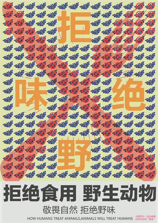 我校孟莉同学的设计作品以“团结力量、拒绝野味、罩顾自己”为标题展开设计。主体图片以密集的形式排列,获得强烈的视觉冲击力,达到警示的目的;画面色彩与构图表现出肯定与力量,传递“我们在一起”的主题思想,站在同一个战场上,共同抗击新型冠状病毒,为武汉加油,为中国加油。