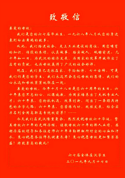 67届武汉老校友给母校的致敬信