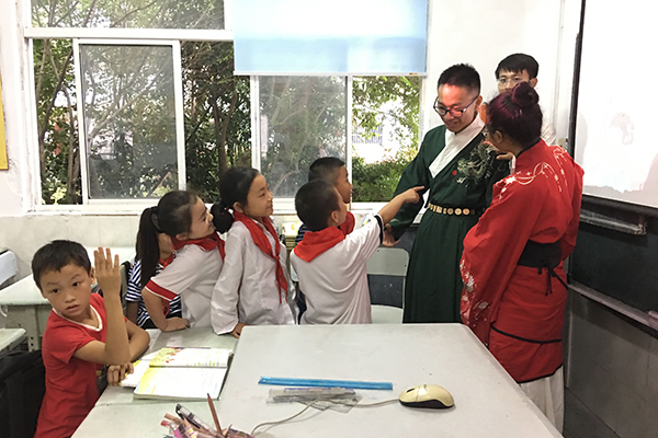 活动面向清和学校“放心班”孩子,汉服社成员用精心制作的课件向孩子们展示、介绍了汉服的样式风格、来源发展及背后的文化与智慧。随后,同学们帮孩子们穿上了典雅多样的儿童汉服,现场带领孩子们练习立容、坐容、行礼、迎宾等汉代礼仪,并在操场与孩子们跳起了汉舞。