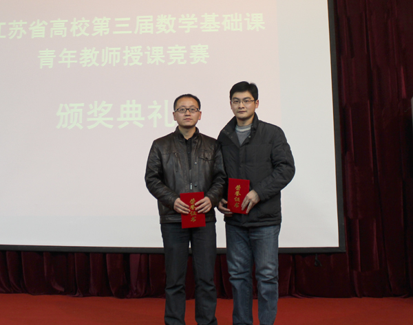 在刚刚结束的江苏省高校第三届数学基础课青年教师授课竞赛中,我校基础课部参赛的两位教师双双获奖,其中朱翔老师的《导数的概念》荣获一等奖,杨先伟老师的《微分中值定理》荣获三等奖。