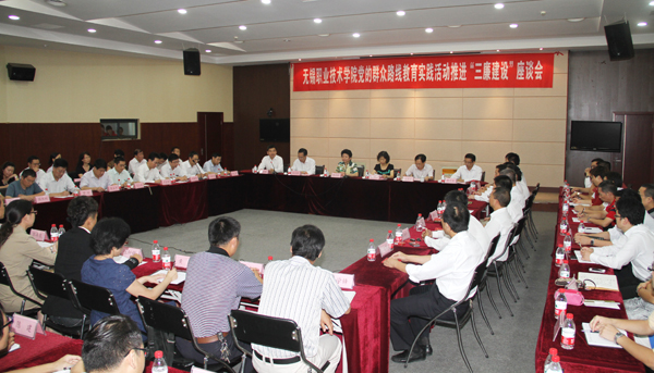 座谈会由校党委书记朱爱胜主持。会上,党委组织部部长王国忠首先代表群众路线教育实践活动领导小组宣布学校“干部廉政、教师廉教、学生廉学”行为规范,接着,副校长周桂瑾、基建办副主任王振华、物联网技术学院教师李萍、校学生会主席张轩铭,先后代表校领导、中层干部、教师、学生四个层面作了交流发言,并作出干部廉政、教师廉教、学生廉学的庄重承诺。
