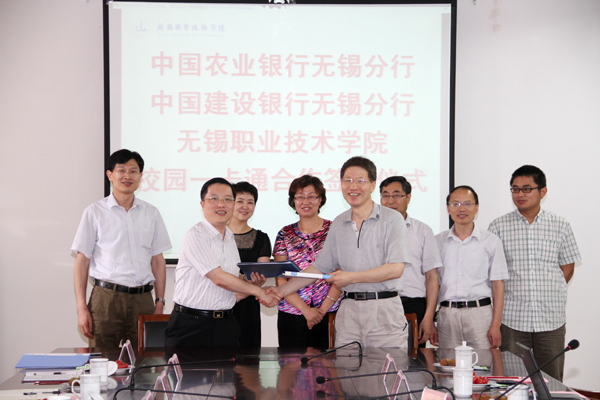 6月20日下午,我校与中国建设银行、中国农业银行关于“校园一卡通”项目的银校合作三方签约仪式在国际交流中心205会议室举行。校领导戴勇、冯渊及相关职能部门负责人,中国农业银行无锡分行副行长周学军一行,中国建设银行无锡分行副行长沈卫兴一行出席了签约仪式。