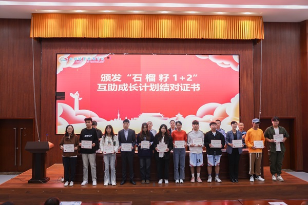 会上表彰了在实践活动中表现突出的16名优秀学生,2名受表彰学生代表分享了实践感悟和收获,展现了我校少数民族学生深入基层,脚踏实地,自找苦吃,提升乡风文明,促进乡村公共服务、讲好乡村振兴故事的青春风采。会上启动了“石榴籽1+2”互助成长计划,向结对师生代表颁发了结对证书。