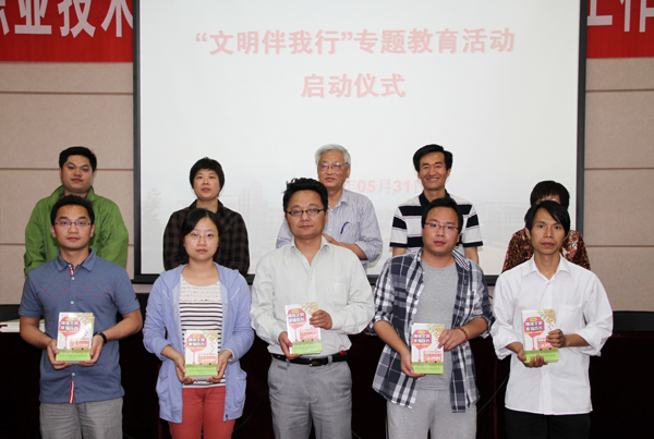 赵凤升主持启动仪式 ,会上表彰了2011年读书征文活动获奖者,学生处副处长吴斌宣读了《关于开展“文明伴我行”专题教育活动的通知》,与会领导向一年级辅导员和学生社团分别赠送了《传承文明 健康成长》、《拥抱文明 幸福成长》丛书。