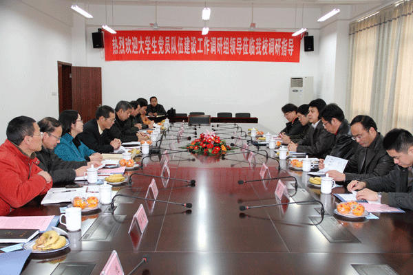 2月28日下午,由省委组织部和省委教育工委组成的调研组一行6人来我校调研大学生党员队伍建设工作。我校党委副书记、纪委书记谈向群、组织部部长王国忠、各院系党总支书记和团委书记出席了调研会。