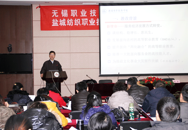 1月12日上午,我校承办的盐城纺织职业技术学院专业带头人研修班,在我校国际交流中心二楼报告厅举行开班仪式。我校戴勇院长、顾京副院长、培训团队老师和盐城纺院张林龙副院长、42名研修班学员出席了开班仪式。