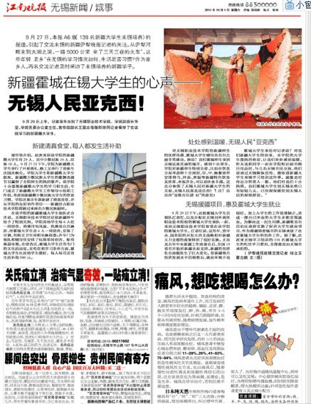 10月1日的新疆《伊犁晚报》和本地《江南晚报》,均用超过半个版面的篇幅,报道了来锡培养的新疆高校毕业生学习、生活情况,其中主要对我校的新疆高校毕业生适岗培训班情况进行了深入采访。