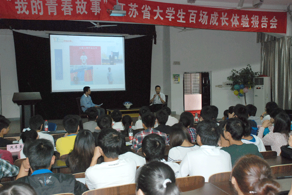 本场报告为无锡市的首场,江南大学汪启涛,我校付楠楠、李梦阳,无锡科技职业学院冯双龙,无锡商业职业学院许昌旭,太湖学院徐晓杰6名同学结合自己的成长经历,配以生动的音频、视频、ppt等资料,给在场的同学们呈现了一场内容丰富、精彩感人的青春故事会,同学们不时对他们的报告给予热烈的掌声。