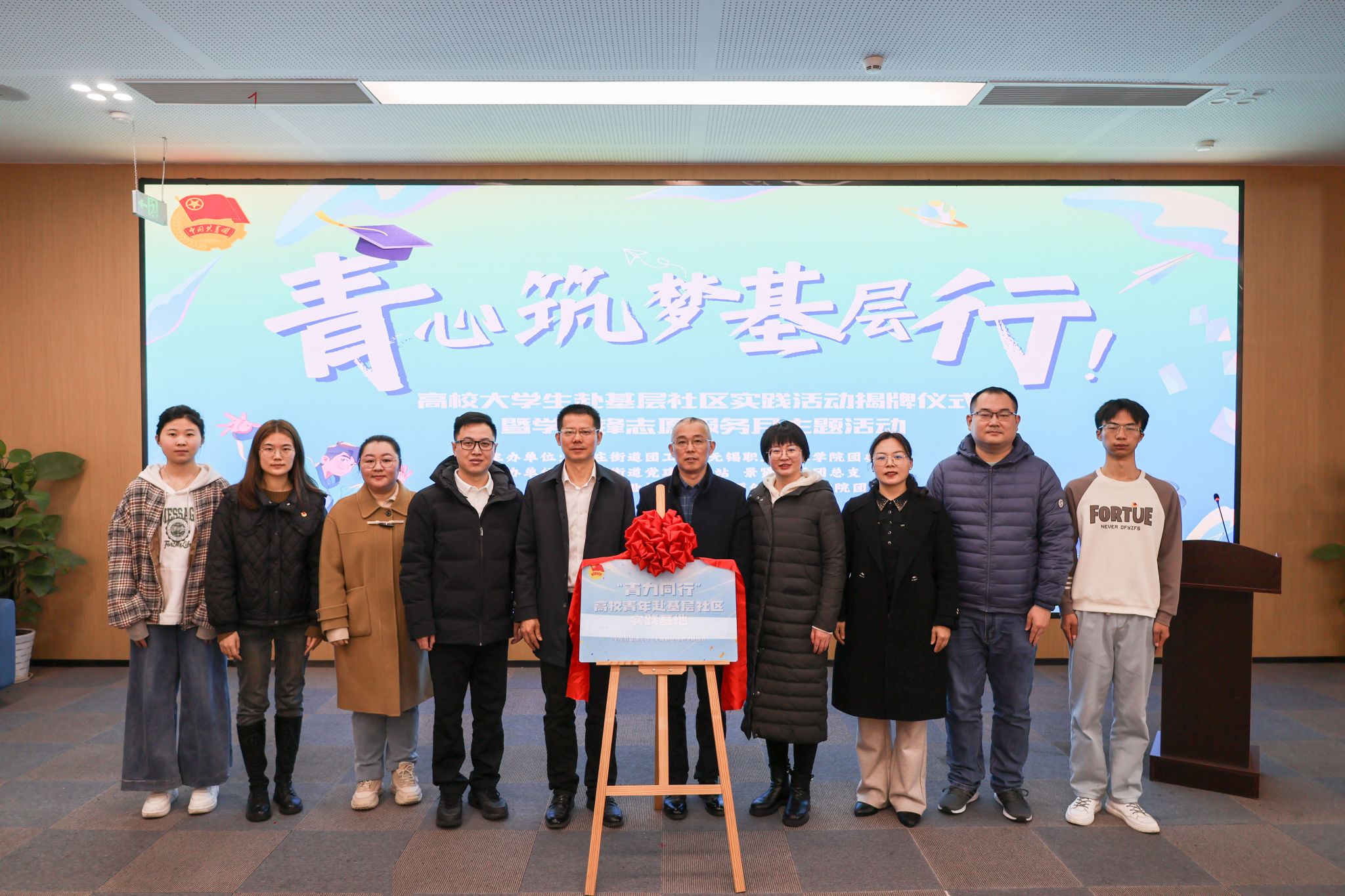 强伟纲和华庄街道党工委副书记、政协工委主任费裕其共同为项目揭牌。这是高校在无锡经济开发区所辖社区的首个实践基地,是校地合作在基层社区实践项目上迈出的新步伐。
