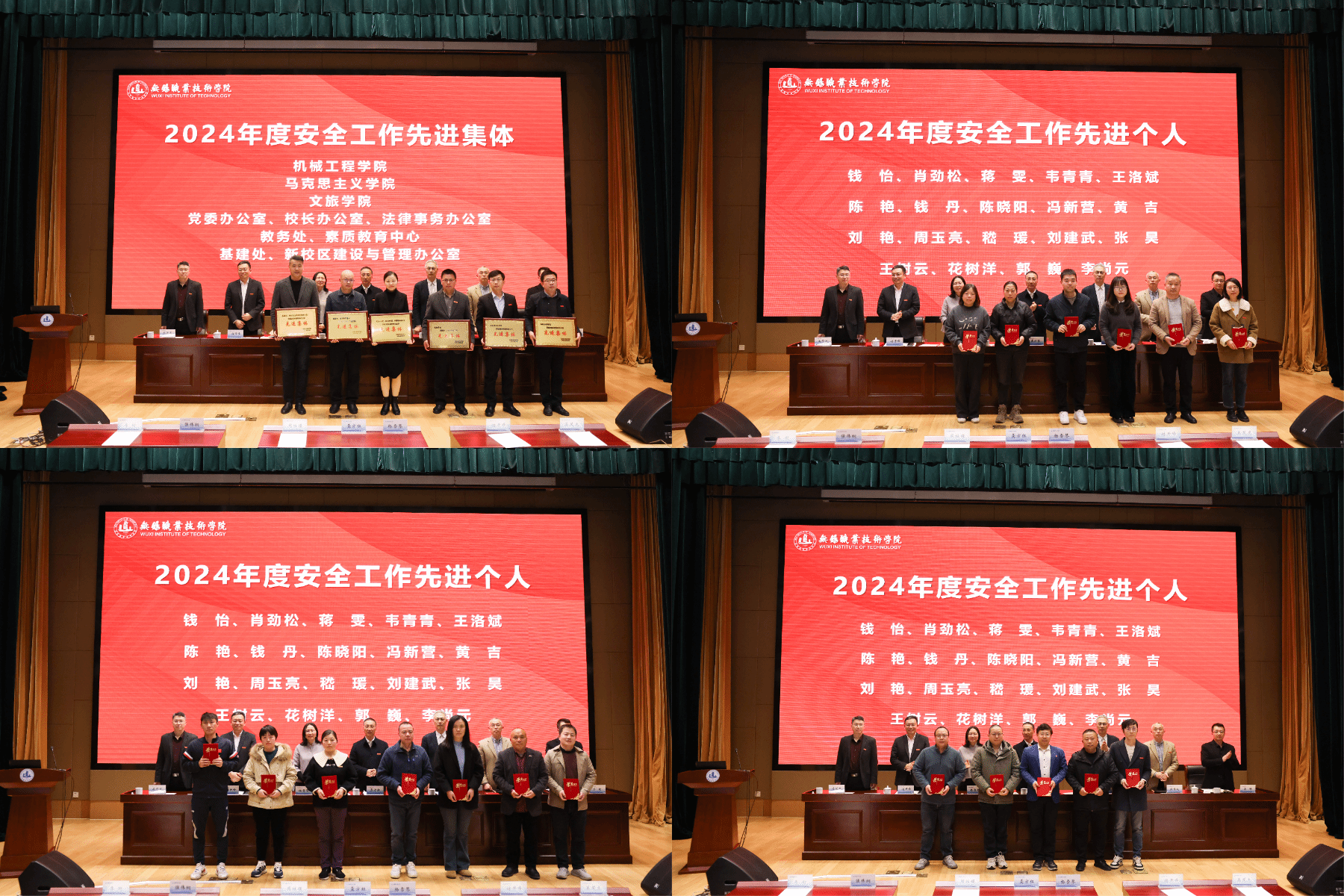 党委副书记杨雪琴宣读优秀集体及个人表彰名单,党委办公室(校长办公室)、教务处(素质教育中心)、基建处、马克思主义学院、文旅学院、机械工程学院6家单位获评2024年度安全工作先进集体,钱怡、肖劲松、蒋雯等19位老师获评安全工作先进个人。到场领导为获奖集体和个人颁发奖牌和证书,王振华、吴伟、钱怡代表先进集体和个人作交流发言。