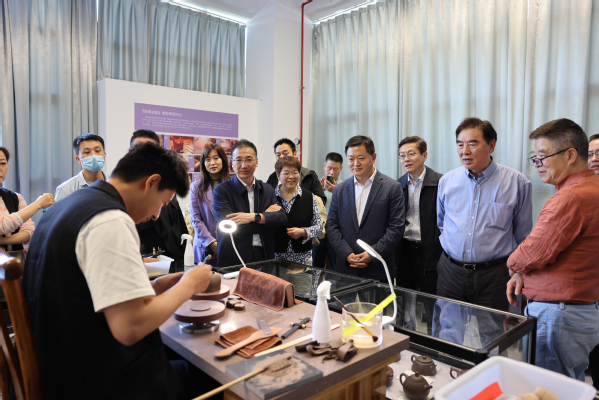 杨雪琴和杨敏共同为客座教授们颁发聘书。宜兴市筋纹器紫砂艺术品中心主任沈建强大师作为嘉宾代表发言。最后,出席本次活动的领导和嘉宾到台前共同为“绎江南文化传承创新基地”揭牌,并参观了紫砂研创、云起工坊、惠山泥人体验馆、无锡地域文化研究会等基地场馆。
