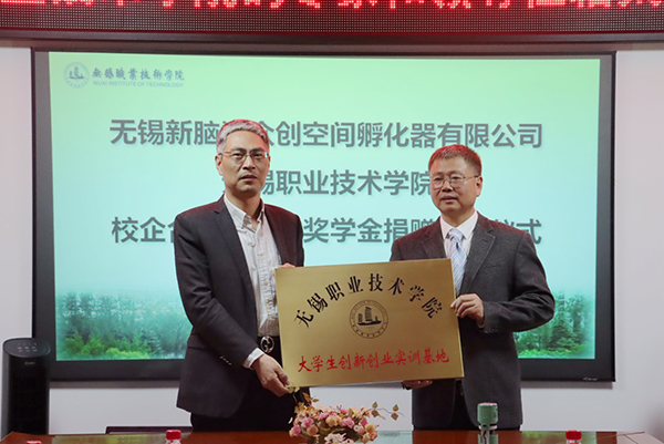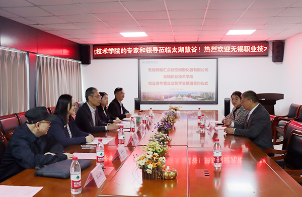 10月19日上午,我校与无锡新脑汇众创空间孵化器有限公司校企合作签约暨企业奖学金捐赠签约仪式在恒华科技园“太湖慧谷科技创业孵化基地”会议室举行。我校校长周桂瑾、财经学院党总支书记李湘、院长赵爽、副院长蒋宏成及相关教师,无锡新脑汇众创空间孵化器有限公司经理宋慧芝,江苏华御信息技术有限公司总经理、无锡新脑汇众创空间孵化器有限公司首席创业导师耿振民出席签约仪式。