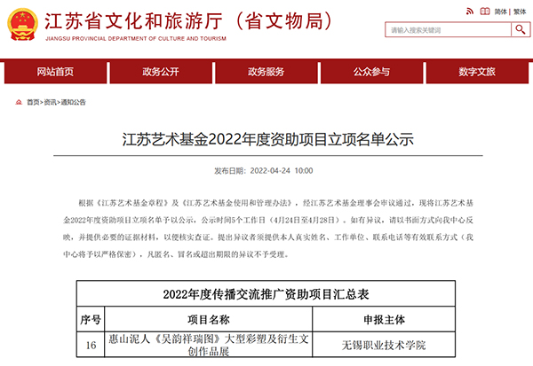 近日,《江苏艺术基金2022年度资助项目名单》正式公布,我校设计艺术学院院长杨敏领衔申报的大型原创彩色泥塑《吴韵祥瑞图》成功入选传播交流推广资助项目,并获得50万元经费支助。这是学校首次申获省艺术基金立项,也是近三年无锡高职院校中唯一申获该项艺术基金资助立项单位。