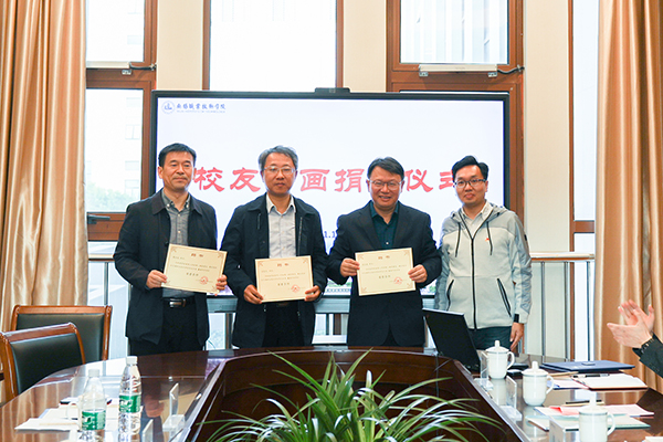 捐赠仪式上,管871班校友、无锡压缩机股份有限公司经理、原学生书法协会会长巫忠兴代表校友捐赠书画作品,校党委书记朱爱胜代表母校接受作品,并为校友颁发收藏证书。校团委书记赵健代表团委为吴志波、巫忠兴、衡兴权三位校友颁发社团荣誉导师聘书。