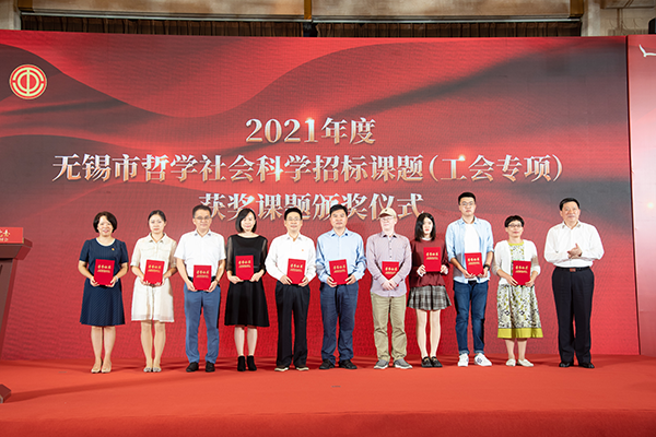 会议发布了2021年度无锡市哲学社会科学招标课题(工会专项)成果,陈德荣为获奖代表颁奖。我校控制技术学院王丽梅老师课题组的结项成果《工匠精神融入新时代职工思想政治教育研究》荣获一等奖,王丽梅老师作为获奖代表在大会作主题经验分享。