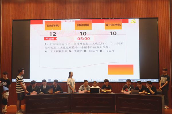 现场共有二级学院经初赛选拔产生的9支队伍27名选手参赛,马克思主义学院直属党支部书记赵后起、宣传部副部长魏艳、校团委副书记郑月圆及各分院分团委书记出席了活动。竞赛内容涉及党的发展历程、党的伟大成就、党的理论知识等内容,既有对百年党史的回顾,也有对辉煌成就的梳理。现场设有必答题、抢答题和风险题三种题型过紧张激烈的角逐最终外语与旅游学院、物联网技术学院、爱尔兰学院代表队胜出,获得比赛的冠亚季军。