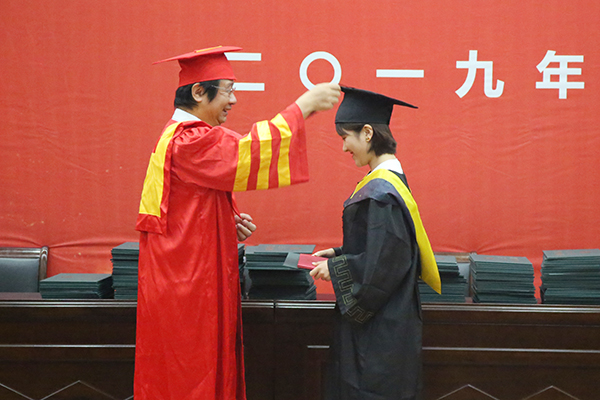 随后,龚方红校长和梅强副校长为全体毕业生颁发毕业证书和学位证书,梅强副校长为每一位学生行拨穗礼。