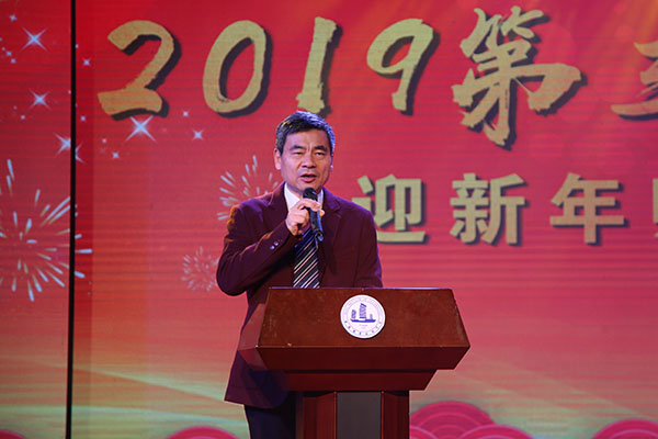 演出之前,校党委书记朱爱胜代表学校党委和行政向全校师生员工致新年贺词。朱爱胜书记指出,刚刚过去的2018年,我们伴随着伟大祖国在新时代前进的最强音,学校发展再上新台阶,胜利召开了第四次党代会,吹响了“建设领军全国的智能制造特色校、创建特色鲜明的高水平应用技术大学”的前进号角。这一年,我们的教育教学改革成果丰硕,科研服务水平持续提升,学生服务工作成绩显著,师资队伍建设取得突破,国际影响力持续扩大,文化建设不断增强。2019年是承上启下、继往开来的关键一年,我们要以学习贯彻习近平新时代中国特色社会主义思想为首要政治任务,深入贯彻落实党的十九大精神和学校第四次党代会精神,进一步解放思想、深化改革、对标补差、创新发展,坚定不移把新时代多宝官方网站推向前进。