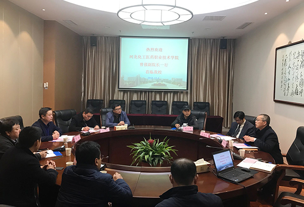 强伟纲副校长对河北化工医药职业技术学院同仁来我校交流学习表示热烈欢迎,简单介绍了我校的办学历史、后勤基建工作、教学工作、人才培养等情况,重点介绍了学院产教融合项目建设情况。双方就产教融合项目的立项申报、设计规划、施工建设等方面进行了深入交流。