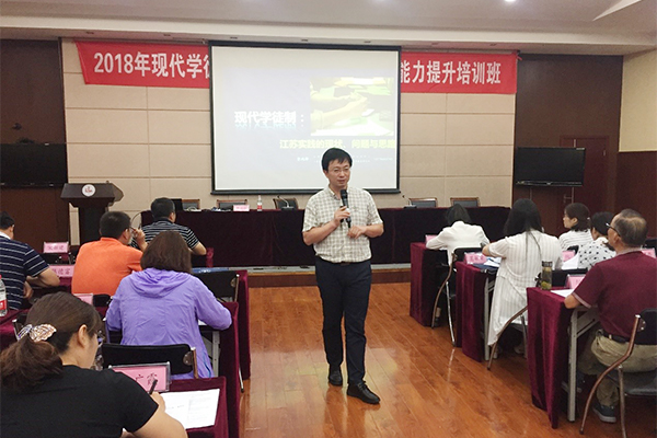 江苏省中职师培中心办公室曹鸿骅主任随后作开班动员讲话,他对各位企业负责人前来参加培训表示欢迎。曹主任指出目前的职业教育还存在许多难点问题,社会对职业教育的认识和重视度不够,能够争取到企业的理解、支持是非常重要的。现代学徒制是职业教育发展寻求的一个突破口,是办出让人民满意的职业教育的一个方向。开班仪式后,曹主任作了“现代学徒制:江苏实践的现状、问题与思路”的专题讲座。