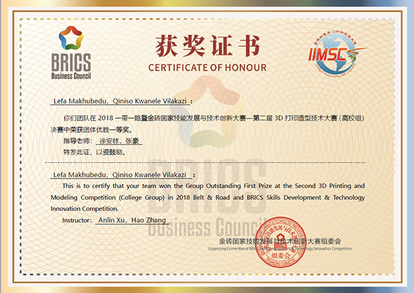 7月5日至8日,2018一带一路暨金砖国家技能发展与技术创新大赛——第二届3D打印与智能制造技能大赛在内蒙古赤峰市举行,来自中国、南非、俄罗斯、印度、奥地利等10个国家的中外技能选手参加决赛。我校南非留学生组成的代表队从众多参赛队中脱颖而出,获得3D打印技术大赛一等奖。