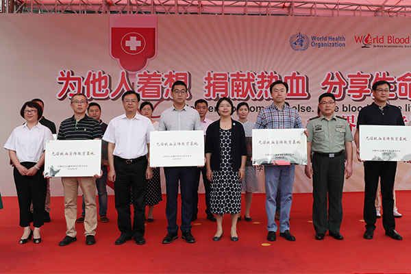6月14日是第15个世界献血者日。6月10日,围绕“为他人着想,捐献热血,分享生命”主题,市卫计委、市红十字会、无锡军分区保障处、市红十字中心血站在南禅寺广场开展了庆祝“世界献血者日”的活动,向包括我校在内的首批16家“无偿献血宣传教育基地”授牌。