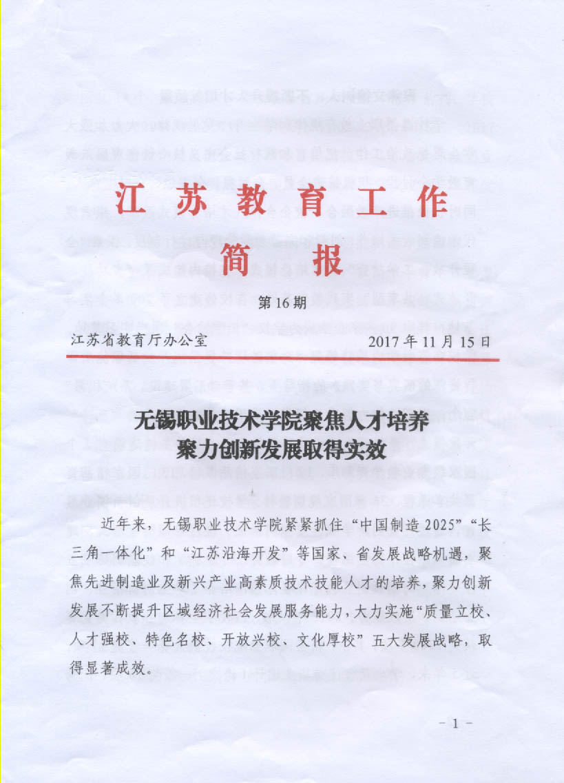 11月15日,《江苏教育工作简报》2017年第16期以《多宝官方网站聚焦人才培养聚力创新发展取得实效》为题,专题报道了我校近年来在人才培养、专业集群、师资队伍、社会服务和国际合作等领域采取的做法和取得的成效。
