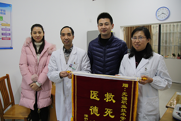 11月23日下午,深圳航空公司工作人员吴立聪在家人和同事的陪伴下来到我校医务室,为李婉莹、梅冰两位医生送上“救死扶伤 医德高尚”锦旗,向救命恩人表示感谢。