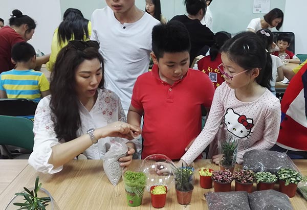 物联网技术学院“物联星空实验室”的丁盛老师和大学生志愿者不仅用通俗易懂的语言向小记者们介绍了物联网技术在当前社会生活中的应用原理、具体案例和技术应用前景,还向同学们演示了精心准备的履带探测车、VR模拟装置等科技实验作品,引起小记者们的浓厚兴趣。艺术设计学院马融老师在“大学生微景观艺术实践工作坊”向小记者们介绍了微爱景观的制作工艺,并与艺术学院大学生志愿者们一起辅导小记者制作艺术景观。晚报小记者在老师的耐心讲解和指导下,与家长一起获得了良好的艺术体验和动手实践的经历,进一步加深了对职业教育的认识和印象。