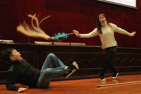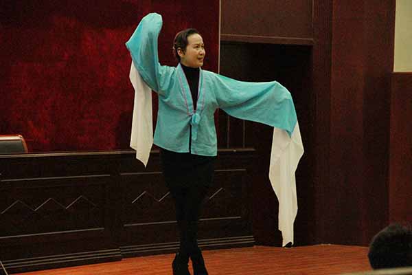 当天下午2点,小王彬彬和过之红老师刚踏入国际交流中心一楼报告厅,就以轻柔的言语赢得全场师生的好感。过之红老师是国家一级演员、无锡市文化艺术研究所副所长,著名锡剧“沈派”关门弟子,她给同学们详细讲解了锡剧的发展历史、流派以及王(彬彬)派、梅(兰珍)派、姚(澄)派、王(兰英)派、沈(佩华)派等著名流派的唱腔特点、表演形式、人物塑造、以及舞台上开门、关门、思考、哭泣等中国戏曲写意表现特点,还当场给同学们表演了一段四季春调《孟姜女哭长城》。