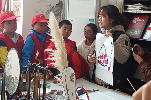 曹亮老师(右一)向小记者们介绍国画技法