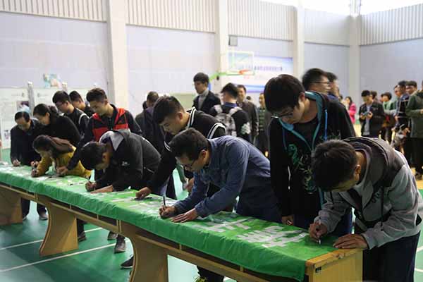 数百名师生还一起在“携手低碳生活,共创绿色校园”倡议横幅上签名,表达共建节约型校园的良好意愿。