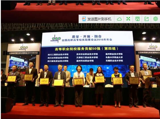 会上为2015年高等职业院校“服务贡献”50强颁发了奖牌,我校获得奖牌。
