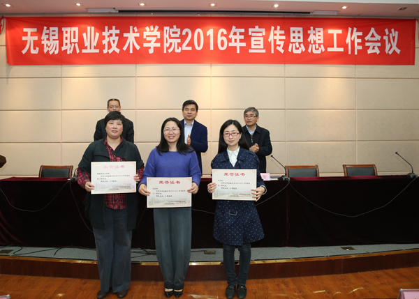 与会领导为获表彰的先进集体和个人颁发了证书,吴慧媛、赵健、徐悦三位同志分别作为先进集体、先进个人和优秀二级网站代表作交流发言。随后,谈向群副书记宣读了2016年学校各部门、学院对外宣传报道指标。