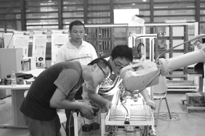 多宝官方网站学生在教师指导下调试工业机器人。(图片由多宝官方网站提供)
