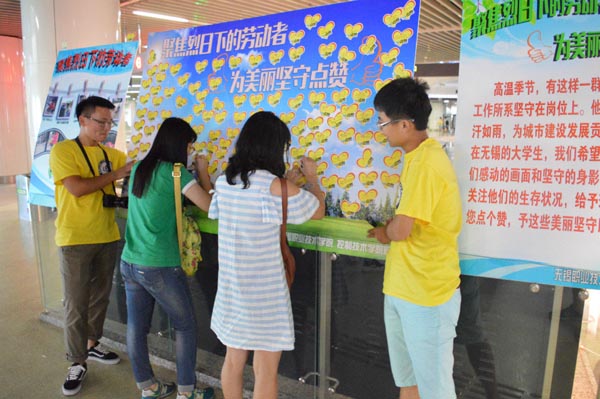 7月16日,志愿者们走进地铁1号线,向往来市民展示这些天来他们采集的美丽画面。画面中有工地上扛着重物的建筑工人,有马路上清扫杂物的环卫人员,有小区里执勤的保安,也有十字路口指挥交通的交警,不同的职业和面孔,相同的却是高温烈日下他们灿烂的笑容和美丽的坚守,正是他们让这个城市日新月异。为了让更多的人关注到他们,感恩他们的辛勤付出,志愿者们将这些天拍摄到的画面做成展板,并呼吁广大市民为这些劳动者点赞。展板上生动的画面,志愿者们诚挚的笑容,让很多往来的路人停下了匆匆的脚步。他们仔细浏览展板上的图片和文字,耐心倾听志愿者们的拍摄见闻,并在点赞卡上留下对劳动者们的认可和感激。从年迈的老人到稚嫩的孩童,从时尚的白领到青涩的学生。每一次的驻足都是一次关注,每一张点赞卡都是一次价值肯定。