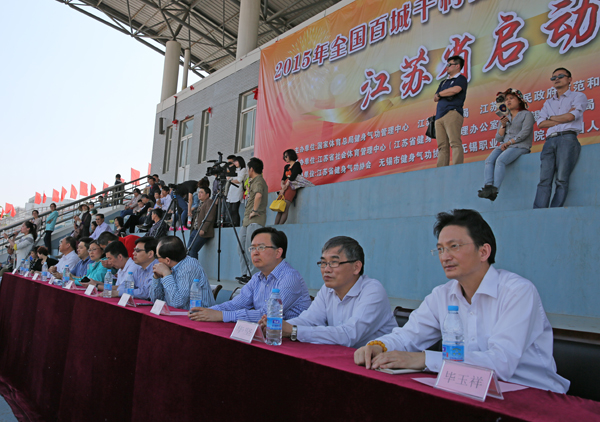 4月26日下午,2015全国百城千村健身气功交流活动“江苏省启动仪式”在我校体育中心田径场举行。省体育局副巡视员吕卫东、市体育局局长陆惠玲、我校副校长华坚等领导出席启动仪式,全市共有近5000名健身爱好者参与了启动仪式表演。