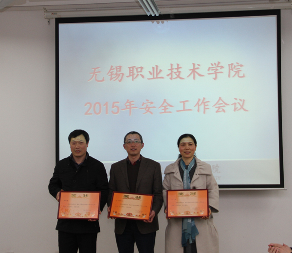 会议由保卫处副处长陶惠良主持。会上表彰了2014年度安全先进集体和先进个人。机械技术学院、控制技术学院、学生处、后勤总公司四个部门作为代表与谈向群副书记签署了《无锡职院2015年维稳与消防安全工作责任书》。雪浪派出所冀晓华警官通报了近期周边治安情况及注意事项。