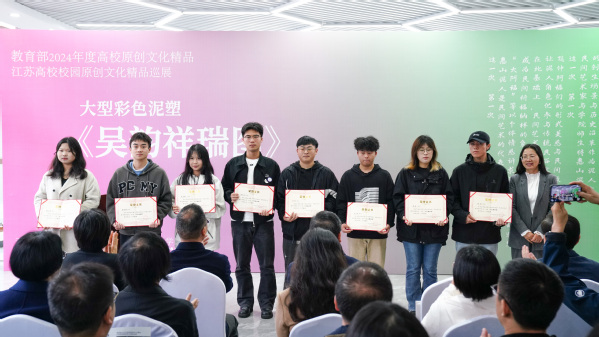 48日上午,教育部2024年高校校园原创文化精品《吴韵祥瑞图》大型彩色泥塑江苏高校校园巡展在我校绎江南文化传承创新基地启动,在锡高校师生1000多人次到场参观。