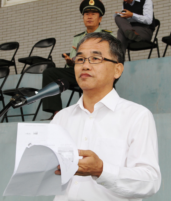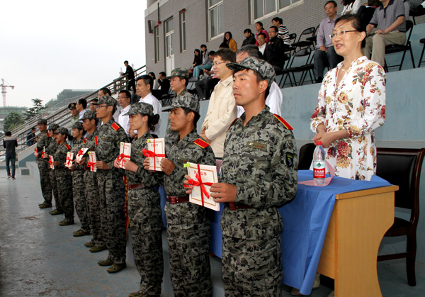 校党委副书记谈向群宣读了《关于表彰2014级学生军训先进单位和先进个人的决定》,16个连队和161名优秀学兵获表彰,校领导和部队首长向先进连队和个人颁发了奖状;校党委书记朱爱胜向承担我校军训任务的人民解放军部队赠送锦旗。副校长华坚对今年的军训工作进行了全面总结,代表学校向承担承训部队全体教官表示衷心的感谢和崇高的敬意,向圆满完成军训任务的全体新同学表示慰问和祝贺,并要求同学们将军训的收获和成果巩固下来,贯穿到今后的学习和生活中,努力把自己培养成全面发展的高素质人才。(魏艳 王卫东 高凤)