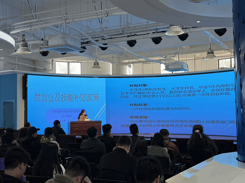 本场讲座邀请了无锡市雪浪街道市场准入条线负责人袁敏锋和社会保障条线创业补贴政策负责人顾梦怡,两位专家以丰富的实战经验和深入浅出的讲解方式,为师生进行了精准细致的政策解读和创业指导,让晦涩的政策变得通俗易懂,赢得了师生的热烈掌声。
