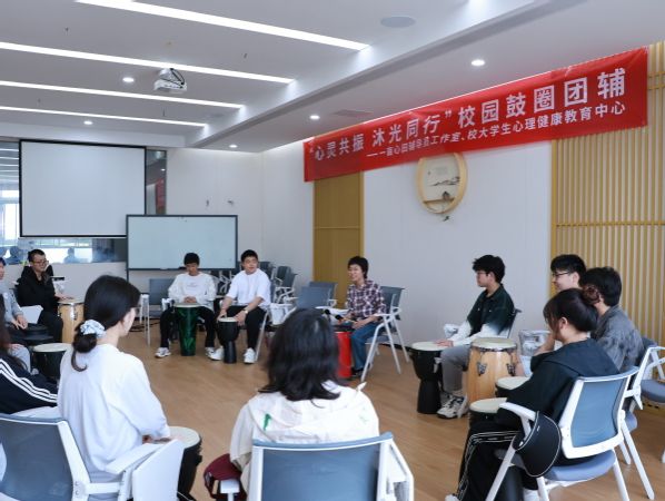 鼓圈是一种无需音乐基础就可以开展的即兴团体演奏形式,它甚至不用语言,就可以在短时间内充分调动演奏者的视、听、触等感官,达到释放压力、疏通动力、融入团体的效果。4月23日下午,大学生心理健康教育中心联合设计艺术学院“一亩心田”辅导员工作室,开展了“心灵共振,沐光同行”校园鼓圈团辅活动,来自全校多个院系和部门的20多名师生参与活动。