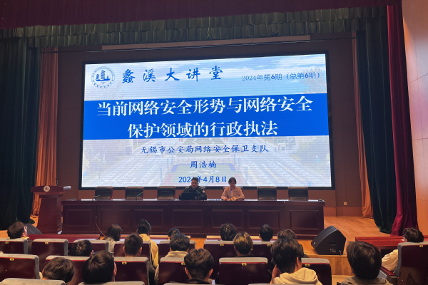 为深入贯彻总体国家安全观,进一步增强大学生的信息安全意识及网络素养,4月8日晚,物联网工程学院邀请无锡市公安局网络安全保卫支队二大队教导员周浩楠为同学们开展了一场主题为“当前网络安全形势与网络安全保护领域的行政执法”的专题讲座。学院党总支副书记朱琳主持,物联网学院师生160余人参加了本次活动。