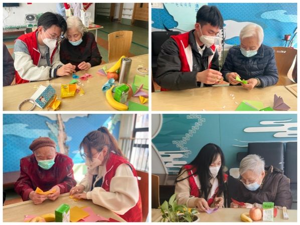 师生们的到来受到了托养中心周维主任、郑姝瑾老师和社工老师们的热情接待。看到志愿者们一张张洋溢着青春朝气的脸庞,老人们喜出望外。志愿者与老人们一见如故,将带来的水果、牛奶与老人分享并亲切交谈、捶背揉肩。随后,在志愿者的指导和陪护下,双方协作进行了樱花折纸的制作。令同学们惊讶的是,这些平均年龄90多岁的老人,理解能力和动手能力很强,即便与部分老人存在语言交流的困难,志愿者依然细致耐心地沟通。看着五彩缤纷的樱花折纸成品,老人们的脸上也露出了花儿般的灿烂笑容,托养中心充满了欢声笑语。