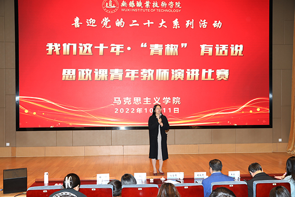 为喜迎党的二十大胜利召开,促进思政课师资队伍建设,10月11日,马克思主义学院在综合楼一楼报告厅举办了“我们这十年•青椒有话说”思政课青年教师演讲比赛。校党委副书记杨雪琴莅临指导,相关职能部门负责人和马克思主义学院全体教师、2022级物联网专业学生、习近平新时代中国特色社会主义思想青年学社成员观摩比赛,活动由马克思主义学院直属党支部书记赵后起主持。