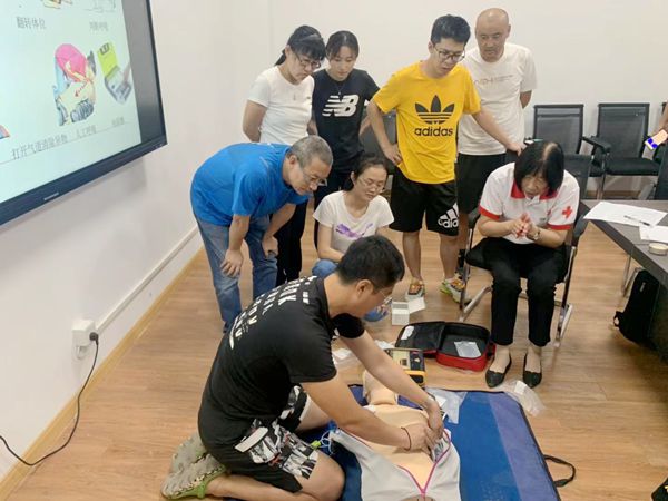 红十字会孙红蕾救护员老师为全体学员讲授了常见的应急救护技能:1. 群众性应急救护的基础理论;2. 现场评估、判断病情要点;3. 心肺复苏的基本做法、成功与失败指征、AED的使用等;4. 创伤包扎技能;5.气道异物梗塞、出血等常用急救技能。随即强调了心肺复苏的注意事项。本次培训重点讲解了在实际救助中,如何抓住最有效的“黄金四分钟”时间,以挽救伤员的生命。老师们认真聆听,观察仔细,全神贯注,教学结束后老师们踊跃参与现场体验。在体育活动中,即便保护措施非常到位,但骨折、擦伤或者撞伤的小事件不可避免。为使现场老师充分掌握相关知识,还利用模拟人演示了心肺复苏的手法及动作要领,并组织老师们实操训练。培训和交流活动让现场教师受益匪浅。