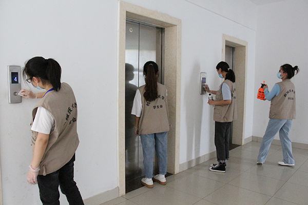 活动期间,学生志愿者们将定期给宿舍区域电梯、寝室、走廊的每一个角落进行打扫、消毒,严防卫生死角;同时对日常出入的学院公共区域进行打扫、消毒,为院系楼宇上课的各位师生服务。